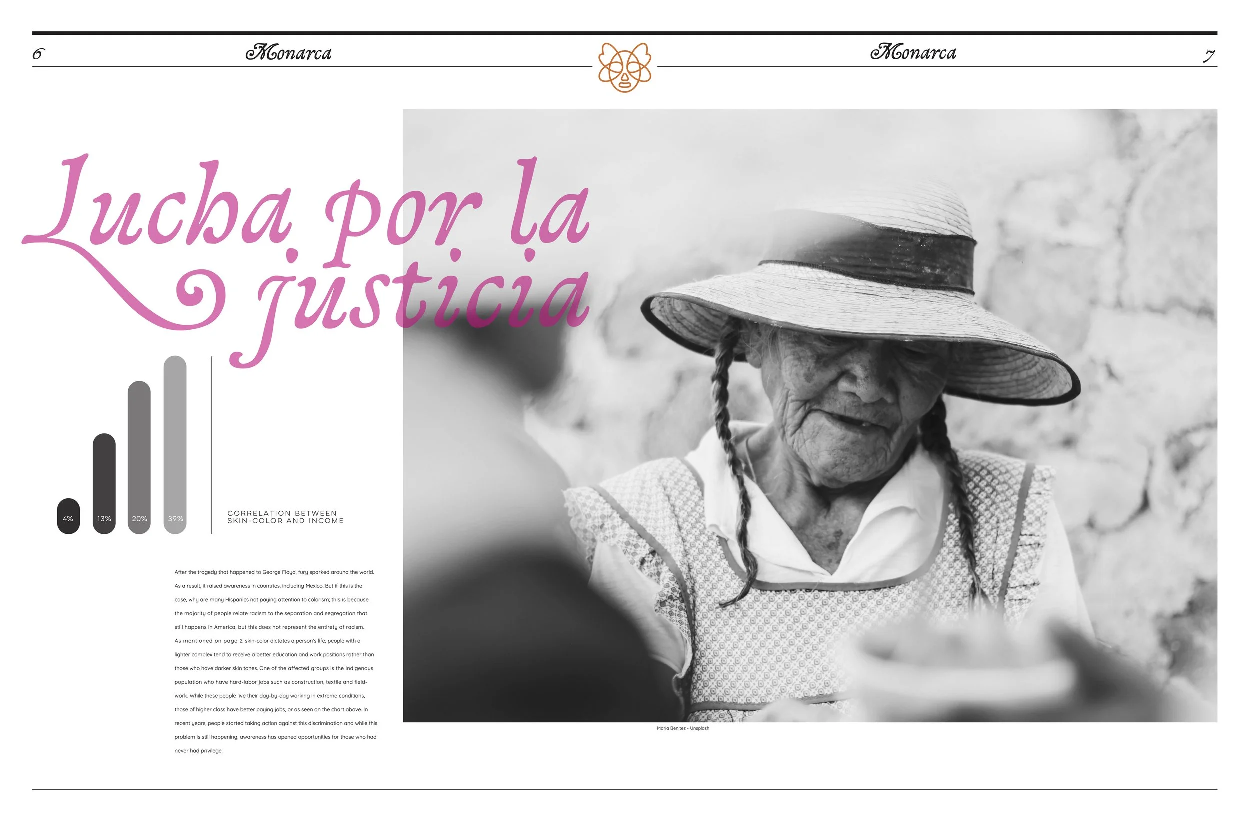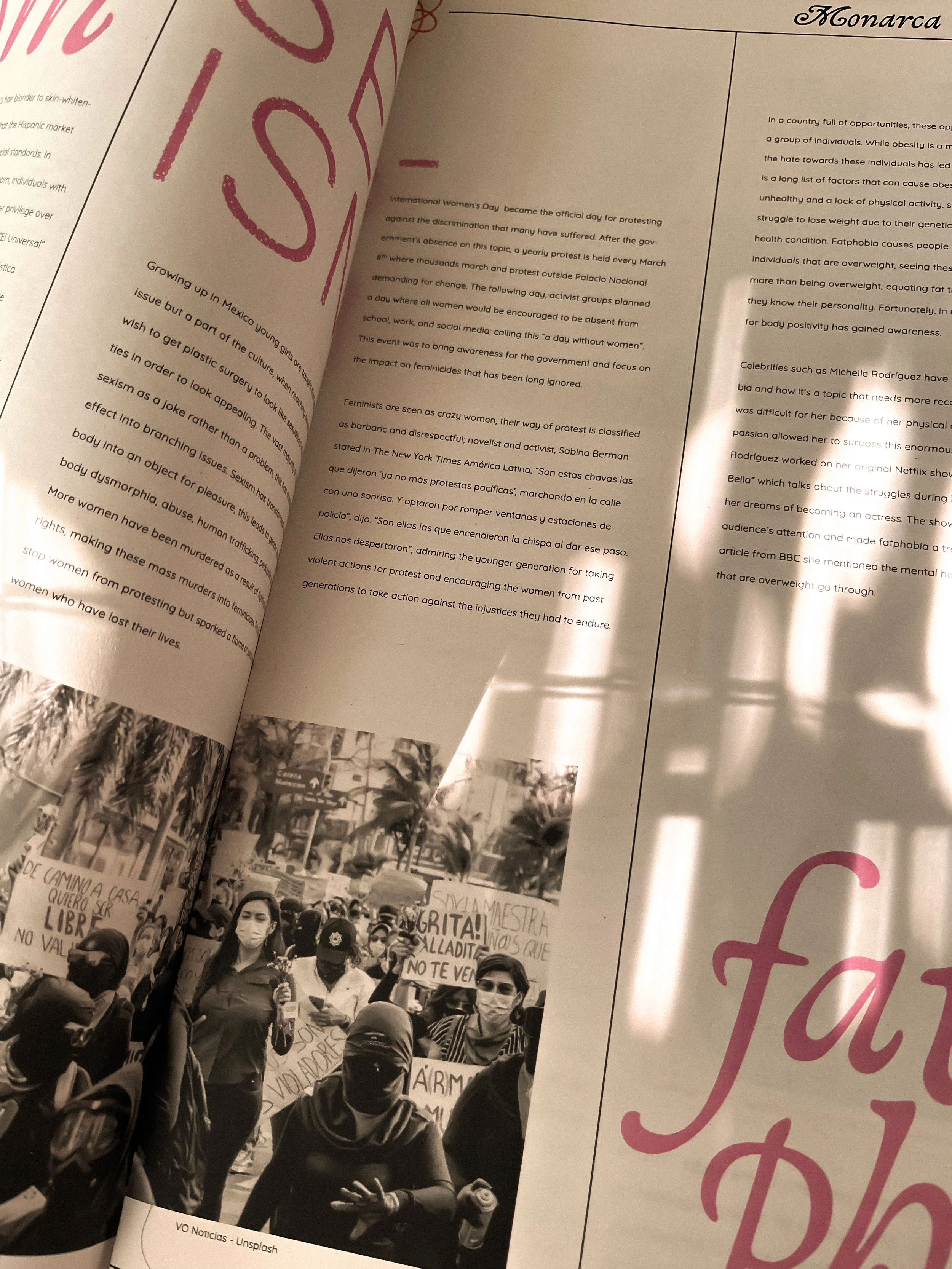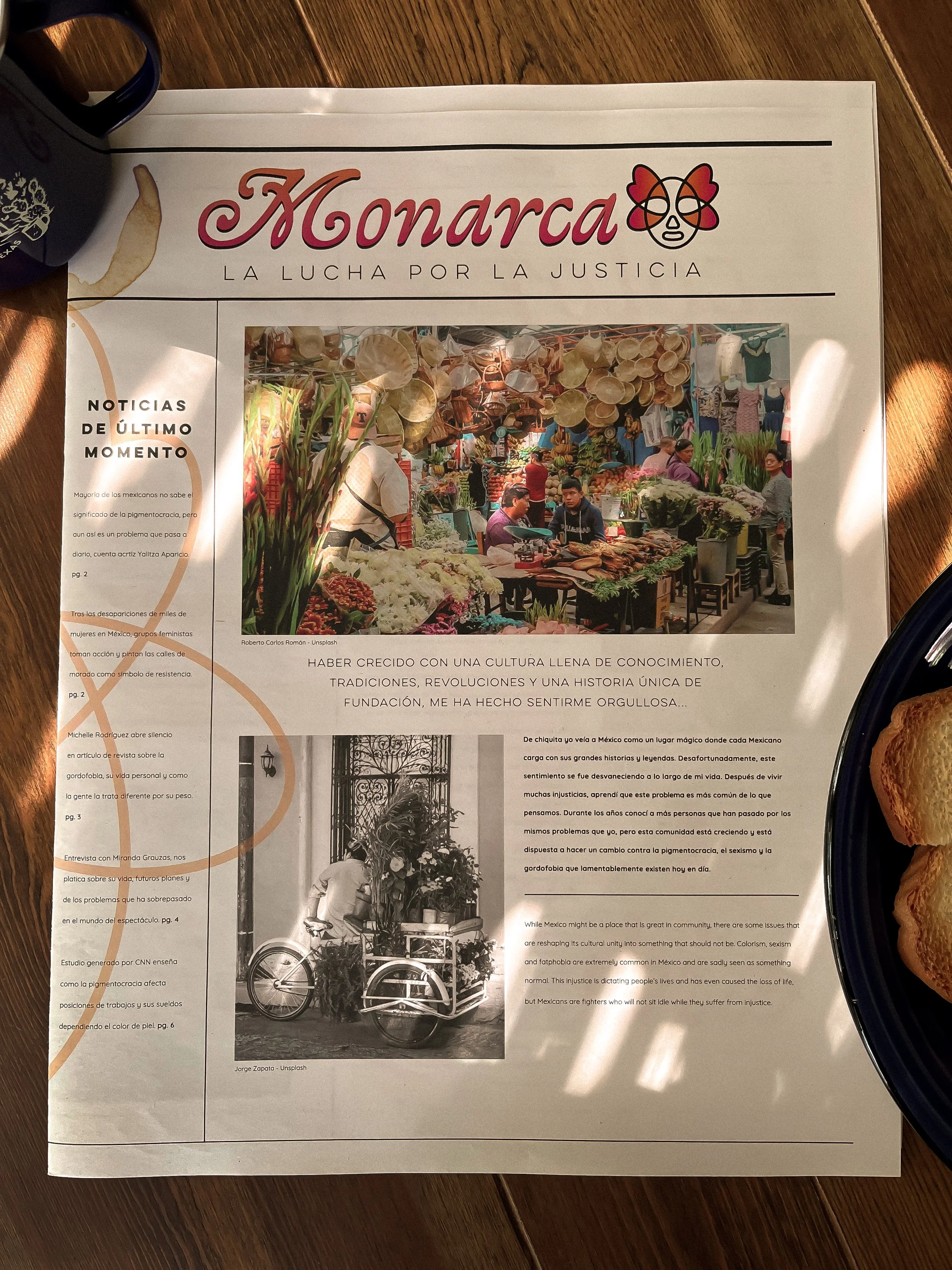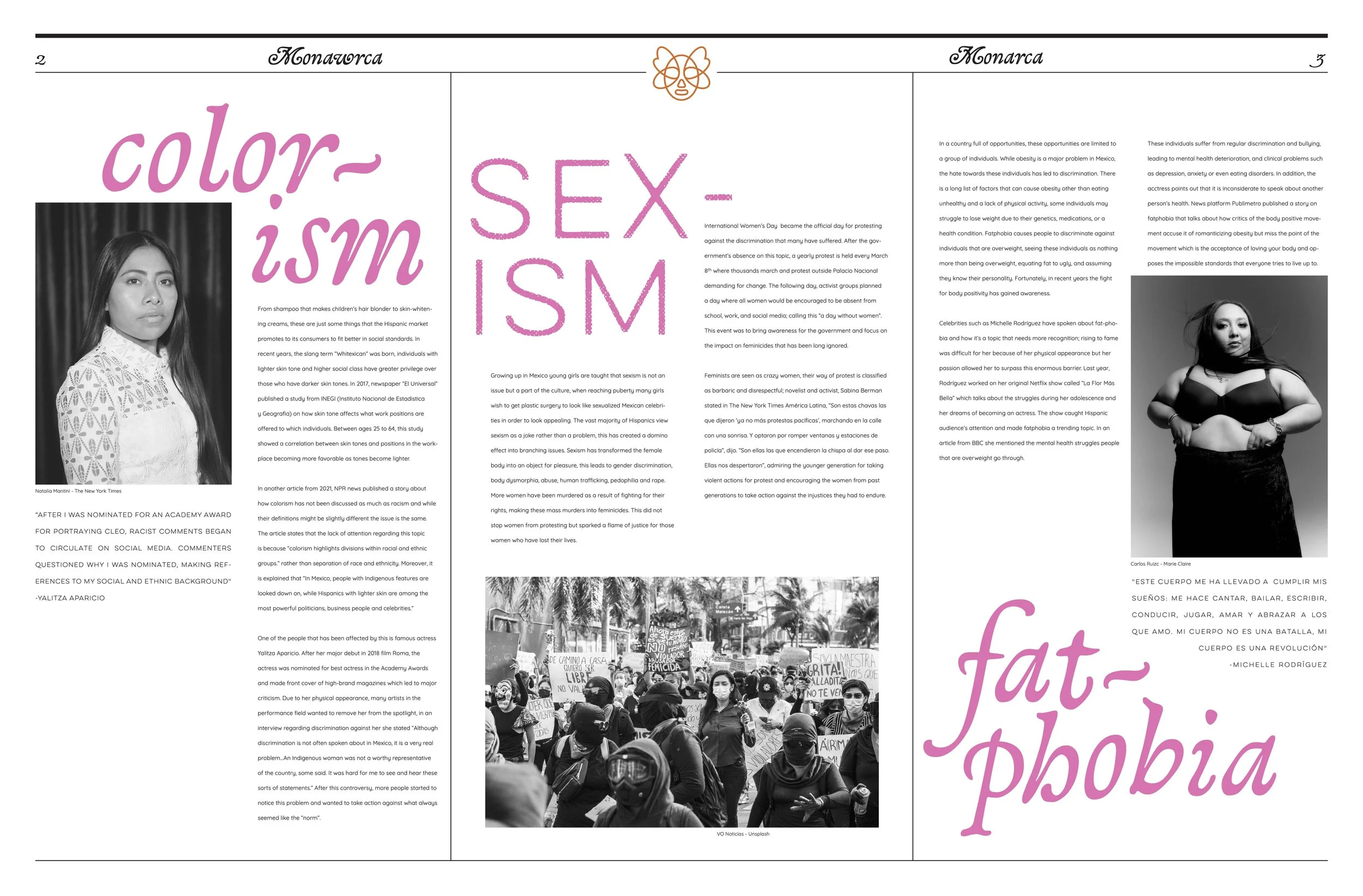 Monarca is a printed newspaper that sheds light on persistent social issues in Mexico, including colorism, sexism, and fat phobia. The publication combines editorial design with investigative storytelling to highlight voices and experiences that are often overlooked. As part of the project, I interviewed actress Miranda Treviño, who shared her own perspective and struggles as a woman navigating these challenges within the entertainment industry. Monarca serves as both a visual and cultural commentary, using design as a tool to amplify conversations that are vital to Mexican society today.